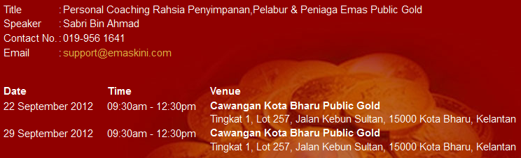 Jika sudah menemuinya , pasti anda akan mula melakukan perjanjian ikatan percintaan bersama emas dan perak :) . Jika anda sukar mencari jawapannya , temui saya secara “live” @ secara online untuk mengetahui jawapannya.Malah anda bakal mengetahui rahsia emas dan perak Public Gold selanjutnya.